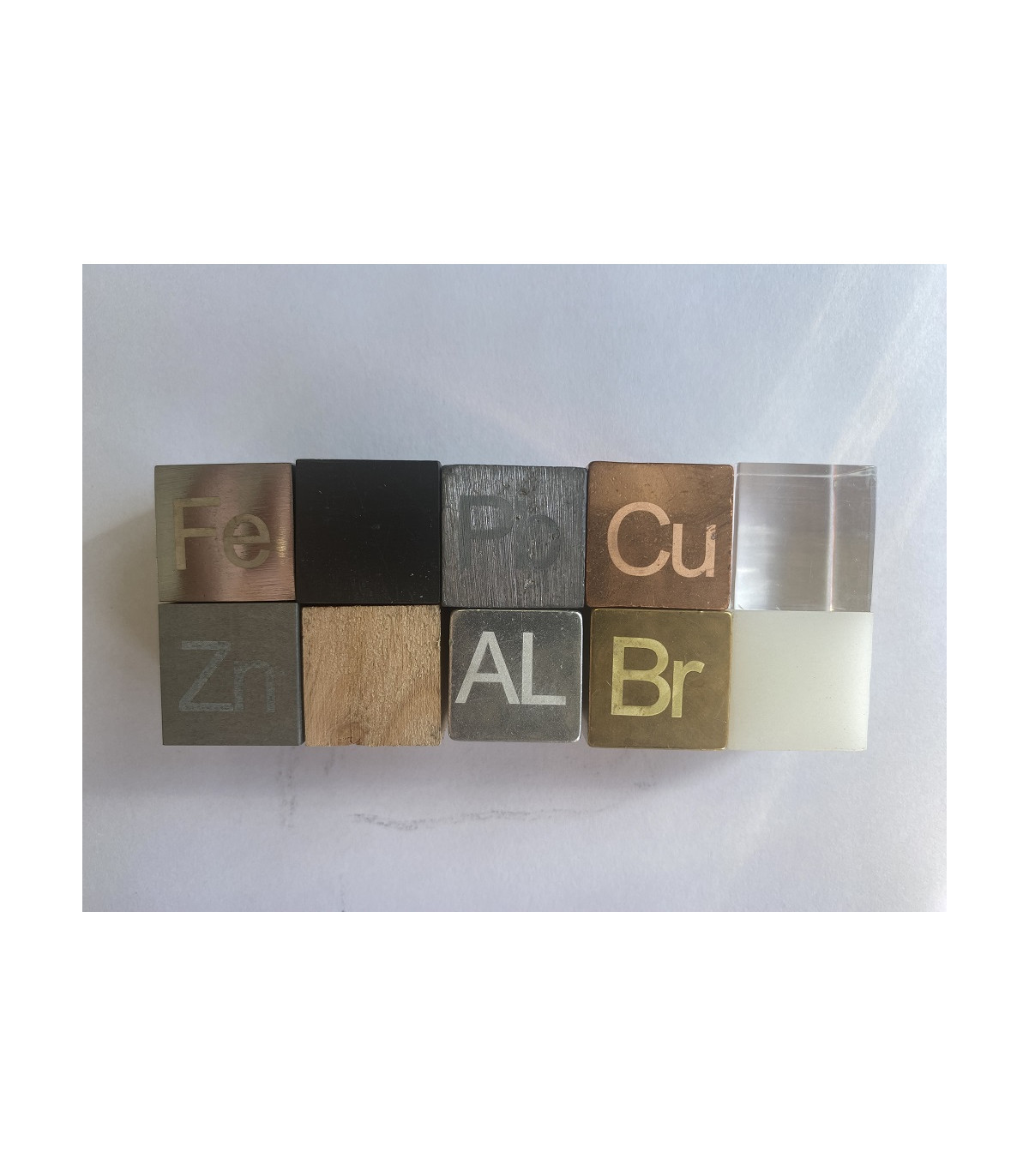 Cubos de diferentes materiales para estudio de densidad. Hierro, Zinc, Plomo, Aluminio, Metacrilato (PMMA), PVC, Madera, Cobre, Latón y Estaño. No identificado