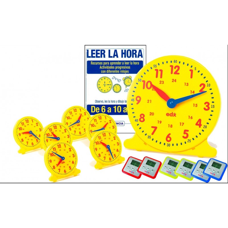 Conjunto de 24 relojes analógicos para alumnos de color llamativo de 105 mm de diámetro, en plástico resistente. Posibilidad de manejo de las dos agujas, graduado en 12 y 24 horas. Copia en 300 mm de diámetro para el profesor.