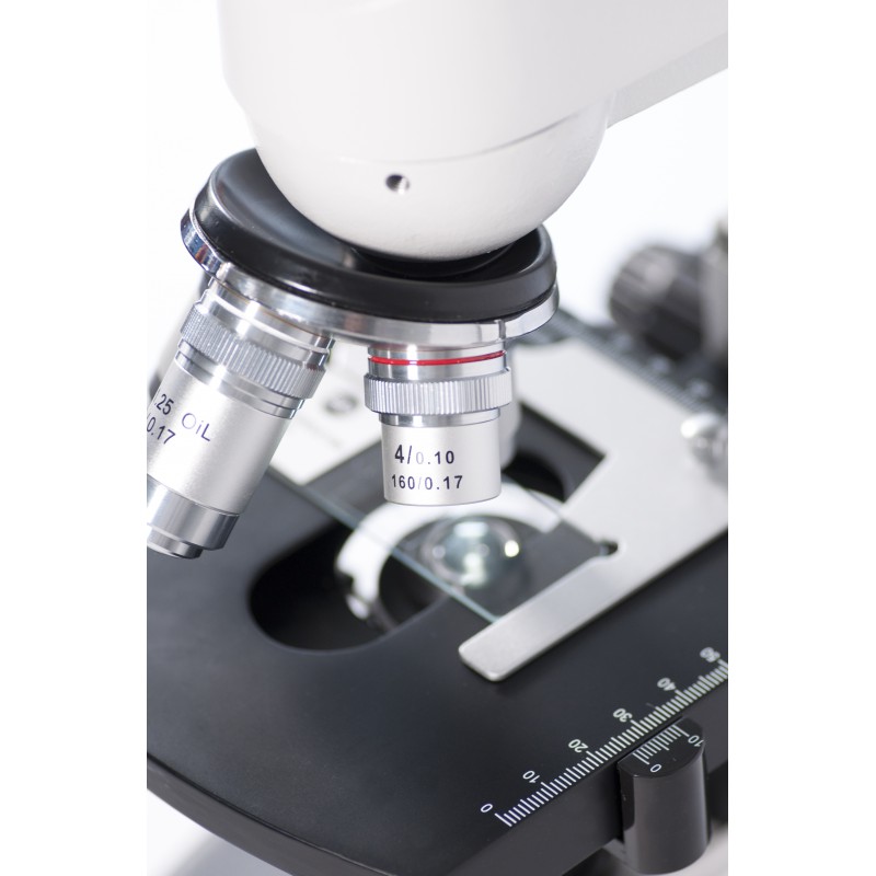 Cabezal binocular inclinado 30º, orientable 360º, distancia interpupilar ajustable y ajuste dióptrico en un tubo porta-ocular. Oculares WF 10x/18. Objetivos acromáticos 4x, 10x, 40x y 100x (retráctil, inmersión). Revólver cuádruple.Platina con carro pa