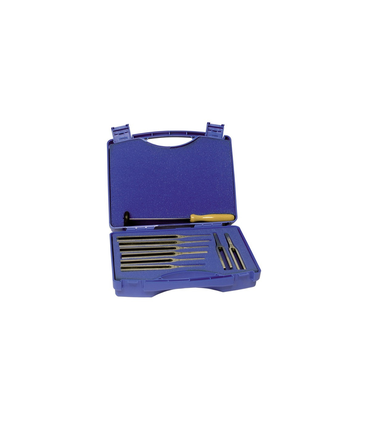 Conjunto de diapasões que abarcam uma ampla gama de experiências. Contém 8 diapasões representando uma escala completa de frequências (oitavas), uma capa protetora e um martelo de borracha. Maleta para armazenamento.