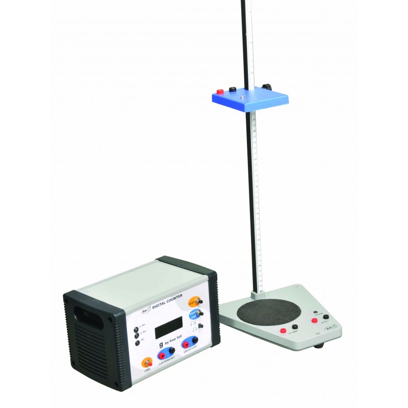 Escala graduada de 600mm. Suporte regulável de plástico com sistema electromagnético para a fixação e escape da esfera no momento e altura determinados pelo aluno.