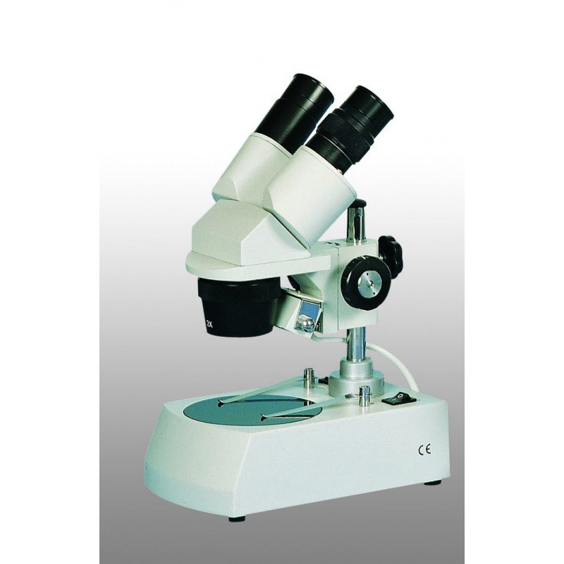 Cabeçal fixo. Aumentos 20x y 40x. Par de oculares gran campo 10x com palas. Objetivas 2x y 4x sobre torre giratória. Tubos inclinados a 45º. Distância interpupilar ajustável de 55 a 75 mm. Iluminação de baixa tensão 12 V, 10 W.