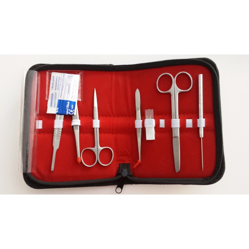 Em plástico, contendo: 25 alfinetes histológicos, 1 agulha com cabo, 1 lâmina para bisturi nr 20, 1 cabo de bisturi nr 4, 1 pinça de disseção curva, 1 pinça de disseção recta, 1 tesoura de disseção pontas finas, 1 tesoura de disseção pontas rombas.