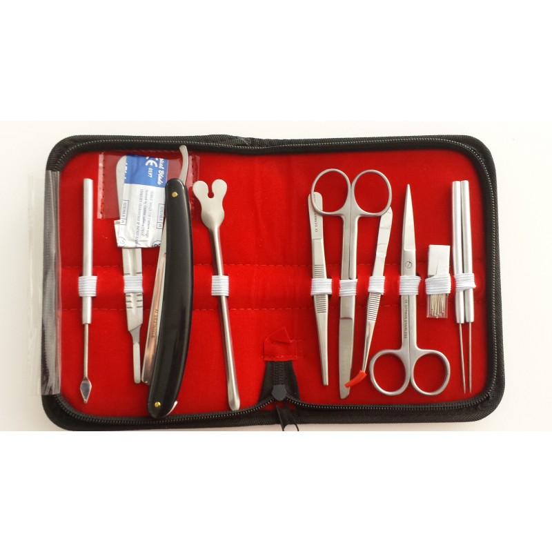 De plástico, contendo: 25 alfinetes histológicos, 2 agulhas com cabo, 1 folha para bisturí nº 20, 1 lanceta com cabo, 1 cabo de bisturí nº 4, 1 navalha histológica, 1 pinça de disseção curva, 1 pinça de disseção reta, 1 sonda canulada, 1 tesoura de disseção ponta fina, 1 tesoura de disseção ponta romba.