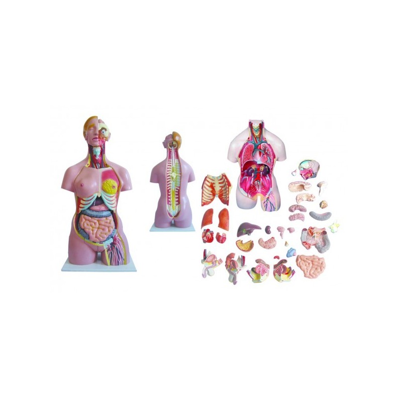 Modelo anatómico humano divisível em partes desmontáveis para seu estudo (homem clássico).Tamanho natural. Inclui cabeça e tronco. Orgãos genitais masculino e feminino intercambiáveis. Constituído por 32 partes. Costas abertas mostrando a coluna vertebral com uma vértebra extraível. Base retangular de plástico rígido. Manual sobre o corpo humano.
