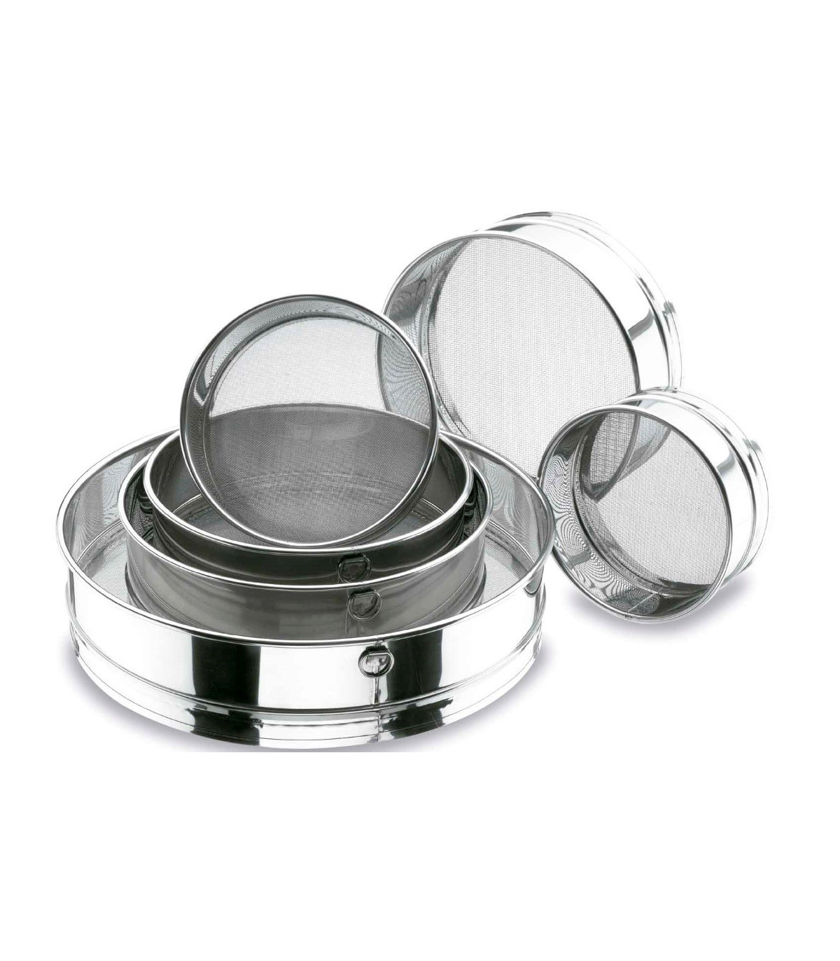 Peneiro de aço inox. Malha Ø 0,75 mm.